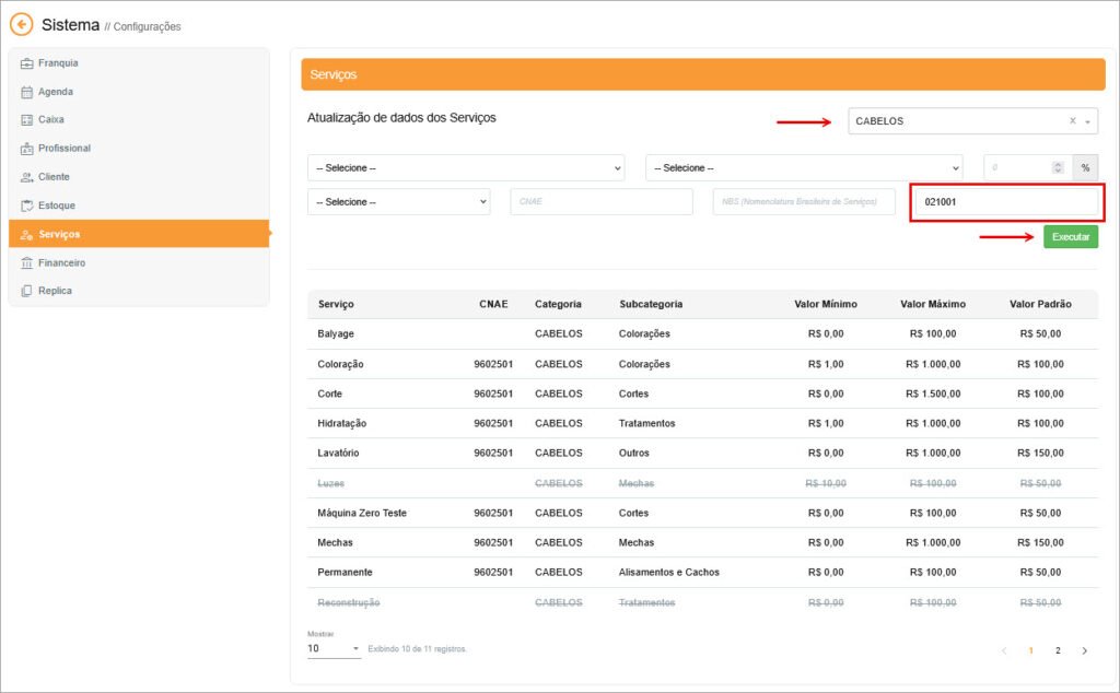 Para adequação em massa, acesse as configurações da franquia em Configurações> Opções de Sistema > Serviços, filtre os serviços por categoria ou subcategoria, preencha o campo ‘Classificação Tributária com o código correspondente e execute:
