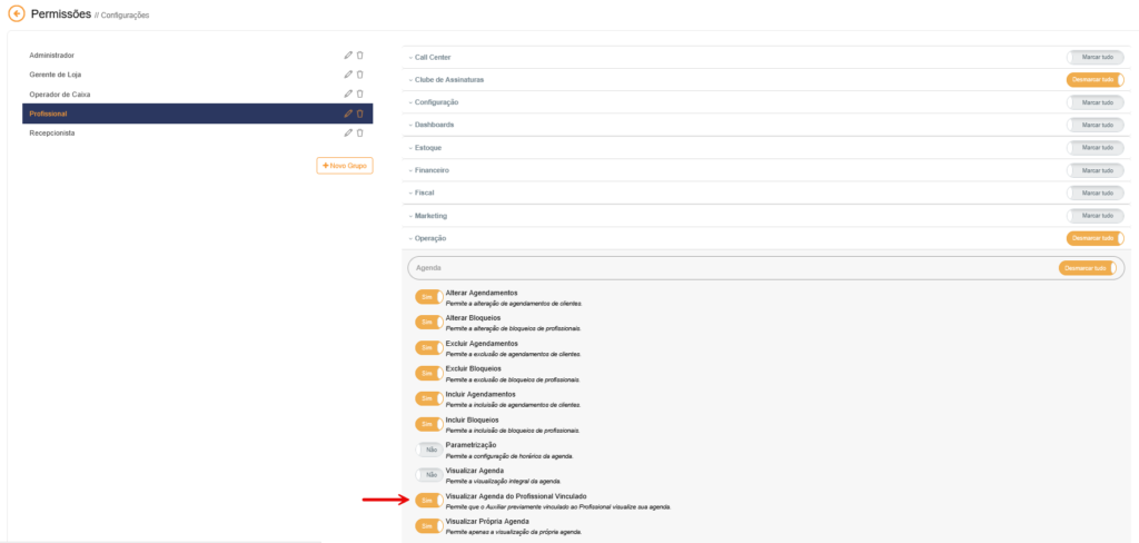 Para que os auxiliares possam visualizar a agenda dos profissionais aos quais estiverem vinculados, será preciso habilitar a permissão Operação > Agenda > Visualizar Agenda do Profissional Vinculado: